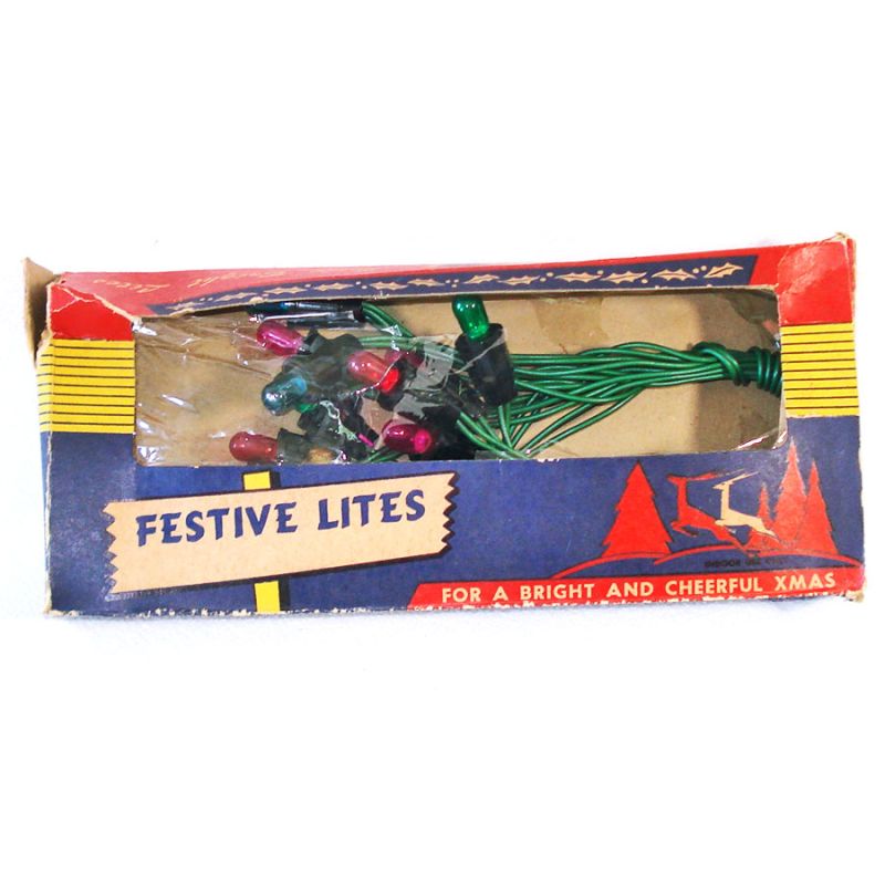 This Mid Century Christmas light string is wrapped in its original coils, never used. It's wired for C-6 bulbs, but these bulbs are the more scarce miniature colored 8 volt bulbs, like those used in the old transformer sets (I believe they're E10 size). I tested a C6 bulb, and the string takes both types. There are 15 working bulbs, all of which light up brightly. The UL tag lists the brand as Reliance. The box the set came in may not be original. You know how it goes - in the hurry to take down the tree after the holidays, things don't always get put back in their correct boxes.