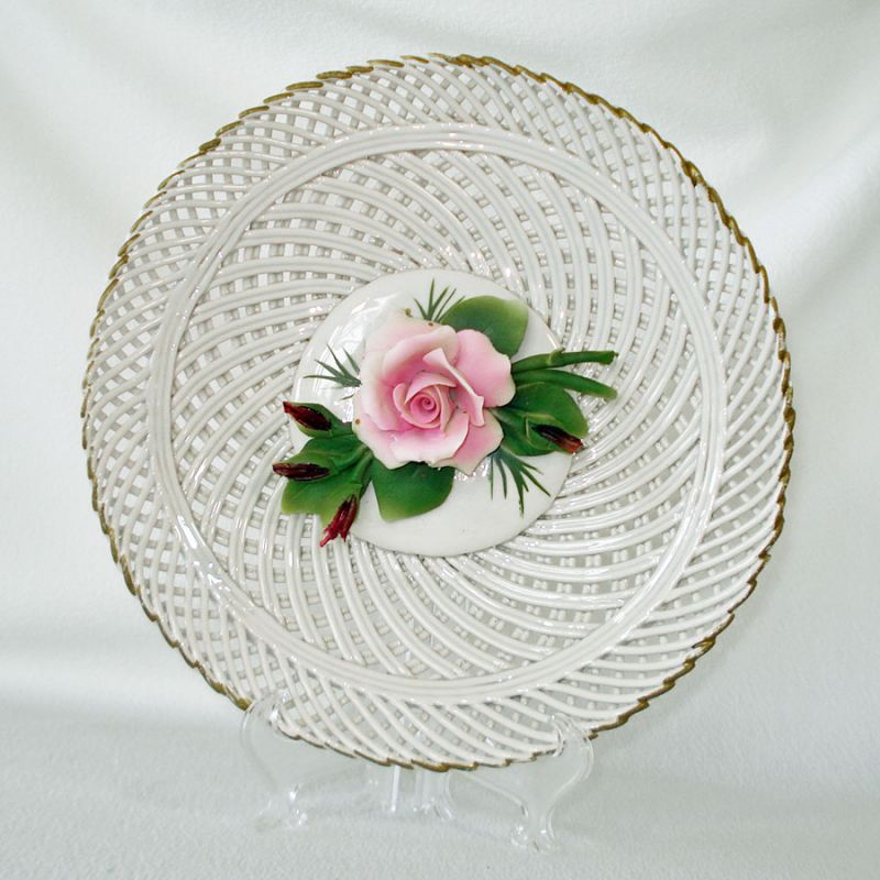 This lovely fine Italian porcelain basket weave dish or plate is a Capodimonte piece, suitable for hanging on your wall or for shelf or cabinet display. It's 8-1/2 inches diameter and has a dimensional porcelain pink rose with leaves and buds at the center. There are tiny sharp edges below the tips of two rosebuds, possible little flakes or fleabites. You have to hold the plate up at eye level and tilt it a bit to even see them. Marked Capodimonte Italy with the crown N symbol.
