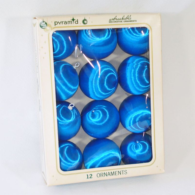 A boxed set of 12 Pyramid Satin Sheen satin covered foam Christmas ornaments from the late 1960s to early 1970s. The color is bright blue, almost a dark turquoise shade. They're the larger, 3 inch diameter size. These ornaments are perfect for making pin beaded, jeweled, and sequined hand crafted ornaments - there's even an illustration of two such such ornaments on the back of the box. Excellent condition - they don't appear to have ever been used.