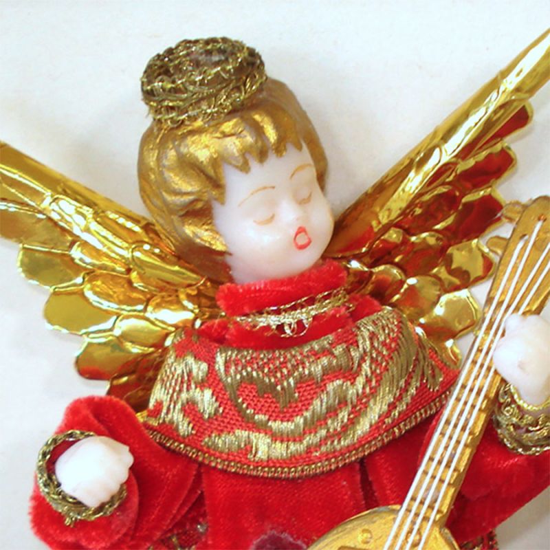 This Mid Century West Germany Christmas angel tree topper figurine was made by Koestel. She comes in her original box and is 8 inches tall to the highest wing tip. The elegant angel has embossed gold metallic foil wings, wax hands and head, and a gold gimp braid halo. She holds a gold plastic mandolin. Her red velvet gown is trimmed with gold braids and gold over red embroidered jacquard ribbons.