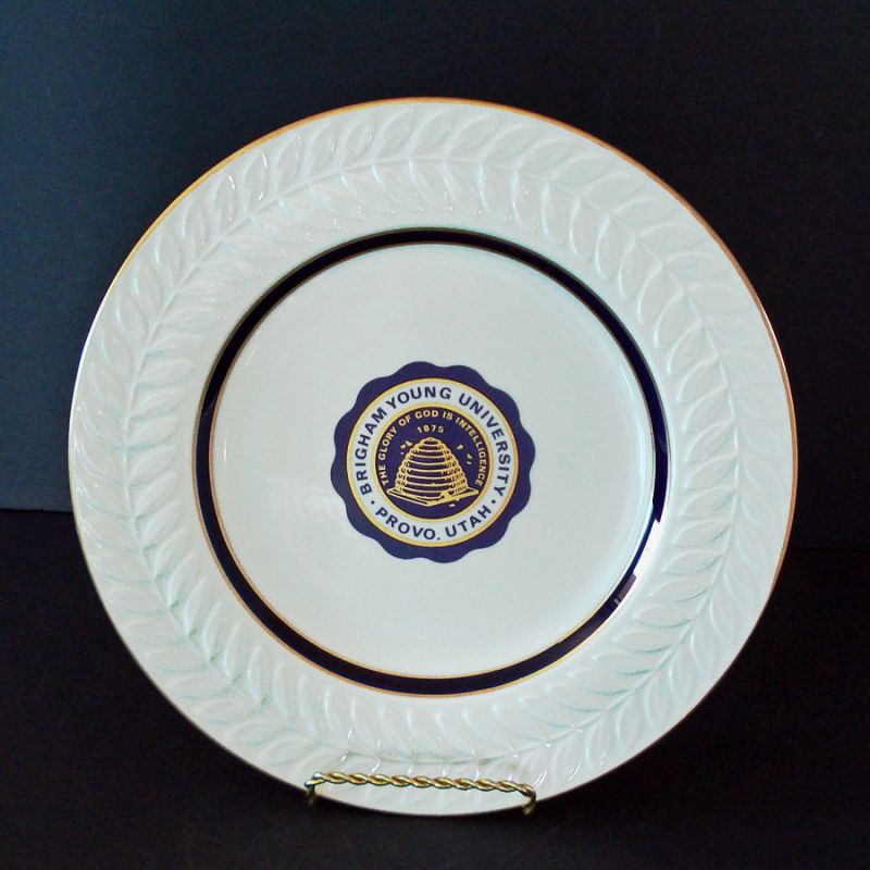 The 10-3/4 inch dinner plate is creamy white with embossed leaves encircling the rim. It's trimmed in gold with a dark blue band around the well. At the center is the University Seal with the motto "The Glory of God is Intelligence" and the LDS / Mormon beehive symbol of industry. The date code on the back is for December 1982, when Anchor Hocking owned Shenango. The plate is in mint condition with no damage, wear, or utensil/stacking marks.