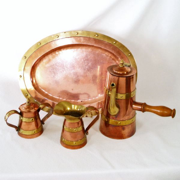 This coffee serving set in solid copper with brass trim likely dates to the Mid 20th Century. It was made in Mexico in the mission style. Included are a 14-1/2 inch oval tray, 9 inch hinged lid coffee pot with wooden side handle, cream pitcher, and double handle sugar bowl with lid.