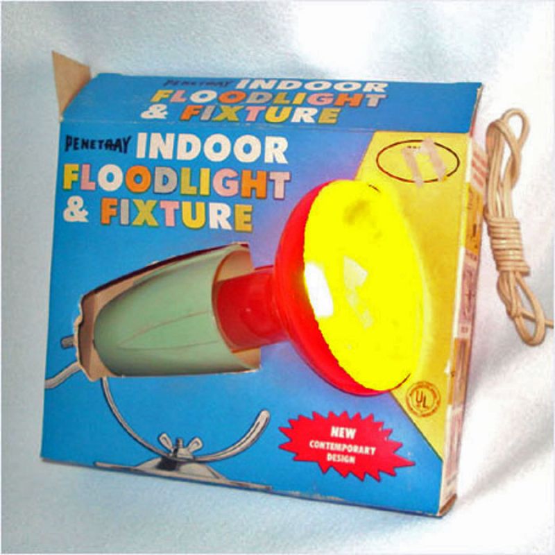 This 1968 Penetray Indoor floodlight and fixture comes complete and working in its original box. It has never been used -the adjustable stand has not been put together and the cord is still wrapped in its original coil. The light can be used on the floor or mount on the wall and has a retro, Eames Era style green plastic cone socket base and a red 100 watt flood light bulb. Use it to illuminate an artificial Christmas tree (I also have a matching green flood light listed) or as a home or party spot light. The box has a little storage wear but the light fixture is in excellent working condition.