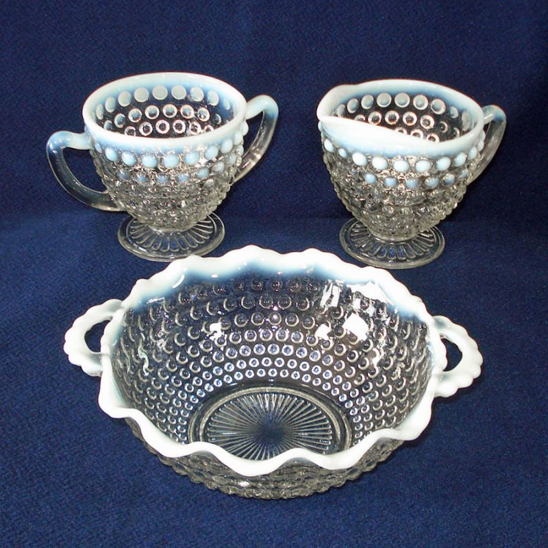 Anchor Hocking made the Moonstone clear hobnail with opalescent rims glassware pattern during World War II, from 1941 to 1946. The three tableware pieces include a creamer, open sugar (no lid was made), and a crimped handled bowl, 6-1/2" diameter not including handles by 2-1/4" deep. The creamer and sugar set are 3-1/4" high by about 3-1/2 inches across the rims. All three pieces are in perfect condition, still glossy with no chips, fleabites, scratches, or other damage.