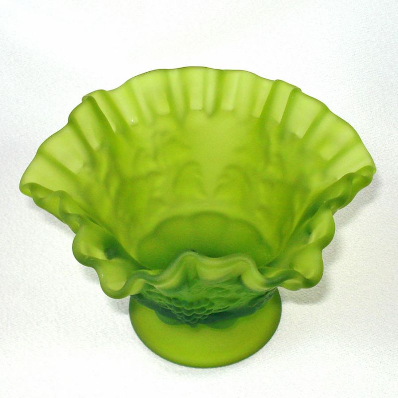 This 1970s ruffled rim candy dish ni\umber PG-114 in Green Mist by Westmoreland Specialty Glass is in the Paneled Grape pattern, which is almost always associated with milk glass. Colors were much less common. The bowl is 4 inches high by about 6" diameter across the rim. In excellent condition with no damage.