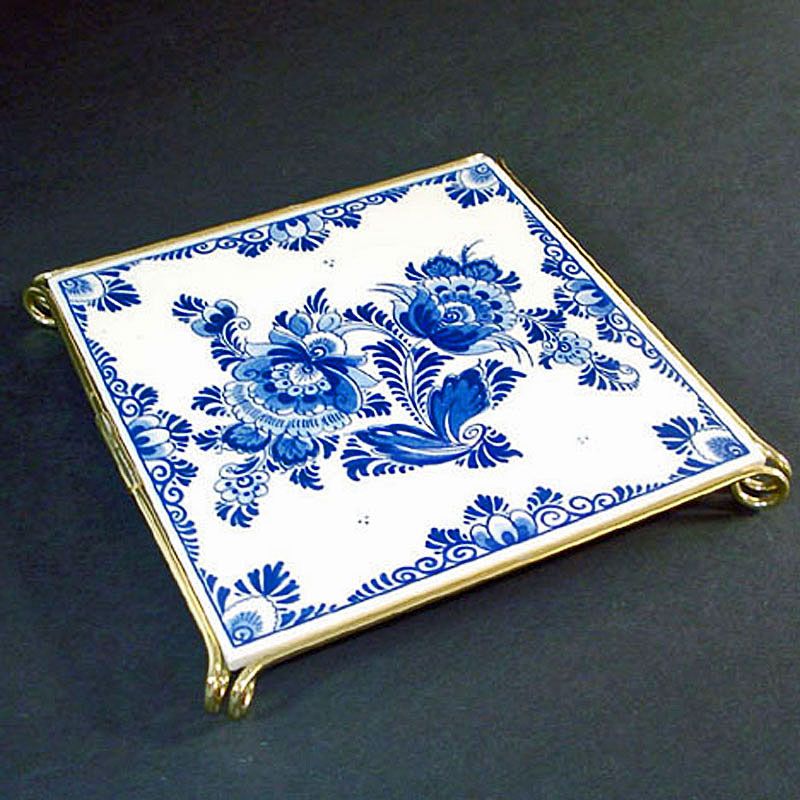 This Mid Century porcelain tile kitchen trivet has a pretty cobalt blue on white Jacobean floral design, similar to Blue Danube. It comes in its original box. The trivet rests on a brass wire stand with curled feet and measures 6 inches square. The back has three marks: a series of numbers, the letter G in a wreath, and Made in W. Germany. The box has a crown over the initials DBL logo but no manufacturer name. The tile is in perfect condition, apparently never used. The box has old tape on on flap, a tear at one window corner, and general storage wear but is intact.
