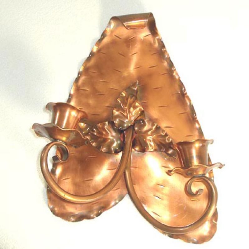 These attractive solid copper candle wall sconces were made in the 1950s by Gregorian Copper Company. The backs are crimped and shaped like arrowhead leaves with curled tips. Each has curled candle holders extend from the centers below a trio of applied leaves. The sconces are about 9 inches high by 6-1/2 inches at the widest points.