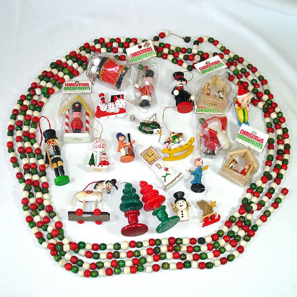An eclectic assortment of 21 vintage painted wood Christmas ornaments plus two strands of bead garland from Taiwan and Japan. Six ornaments are still sealed in their original packages: 2 Nativity scenes, 2 different toy soldiers, Santa Claus, and a drum (actually the drum doesn't appear to be wood). All were made in Taiwan in the early to mid 1970s. One Nativity scene has a broken roof slat, loose in the package.