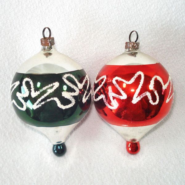 The other two ornaments are less than 3-3/4 inches high. They're bright silver with rust red and very dark green center stripes, decorated with which mica glitter squiggle lines. These are post-war Western Germany ornaments, made during the late 1940s to early 1950s. There is some minor glitter and finish wear consistent with age. No chips or breaks. The photos show a lot of reflection and glare spots that should not be mistaken for paint loss.