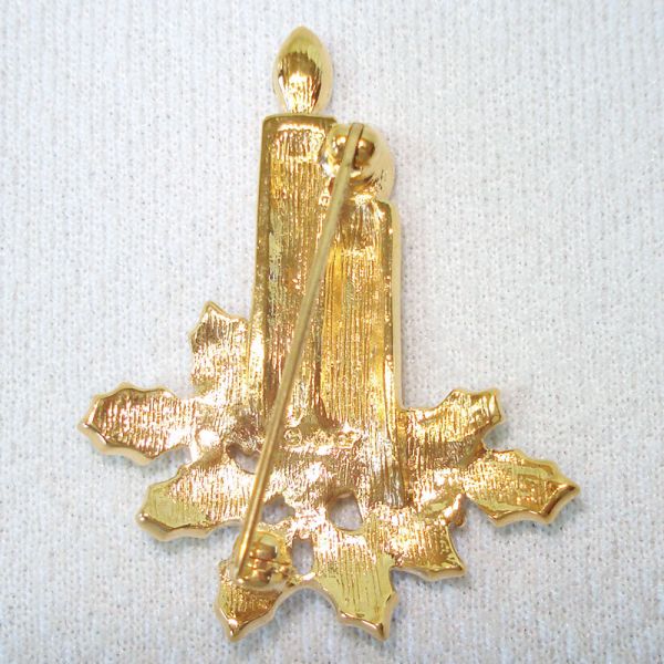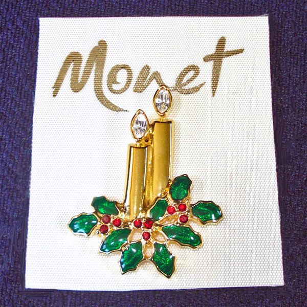 This vintage Monet Christmas pin or brooch comes on its original card and appears to be mint and unused. It's a pair of goldtone Christmas candles with clear marquise rhinestones as flames, set in a spray of green enameled holly with tiny red rhinestone berries. The back is marked Monet. The pin is 1-3/4 inches long by 1-1/2" wide and in perfect condition with no damage or wear. The card has very slight wear to the fine linen threads at the edges.