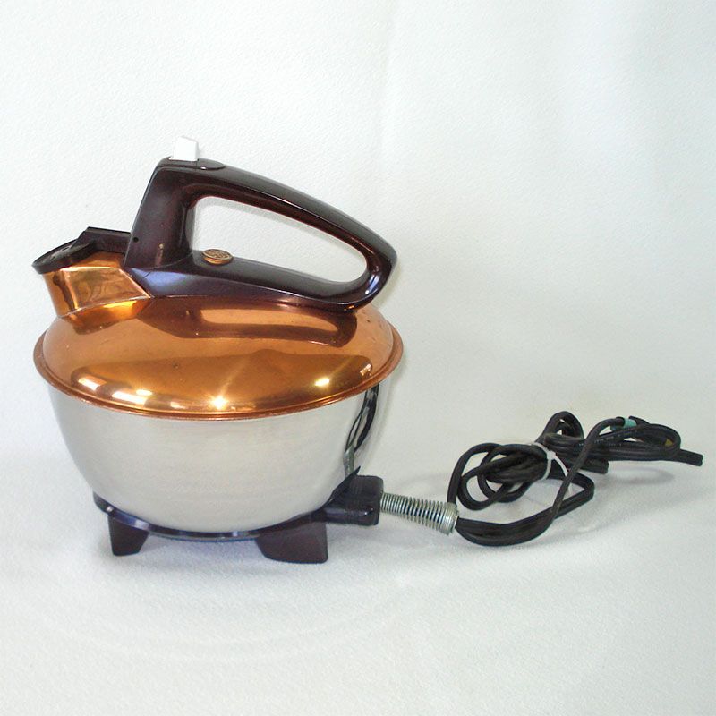 This very nice late 1940s General Electric copper and stainless steel electric water kettle is the Automatic Speed Kettle model 15K20 and holds up to 2-1/2 quarts. The base, handle, and whistling spout cover are brown Bakelite, the lower half is shiny stainless steel, and the upper part of the pot is solid copper. The white push button on the handle locks in place for easy filling - just depress it again to release.