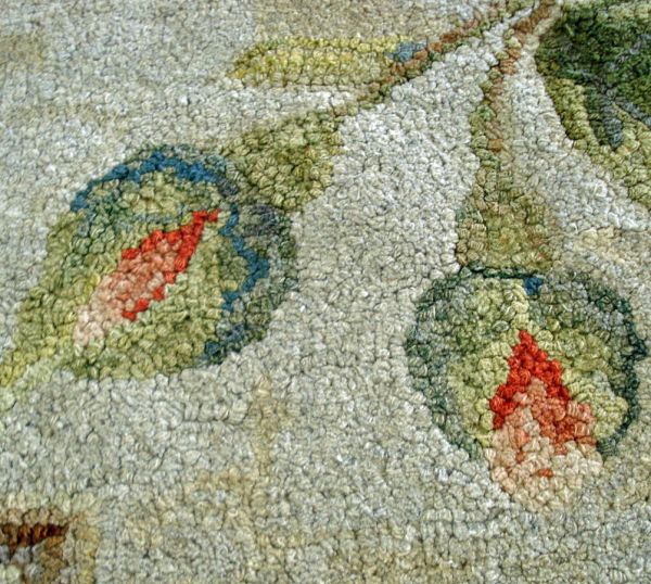 Circa 1930s, possibly earlier, hand hooked rug on burlap with a pretty rose spray decoration. It measures about 25 by 30 inches. The stitches are very close together. The wool is not typical or modern rug yarn, it appears to be very narrow strips of flat, loosely woven coiled or twisted fibers. A strip of old cotton seam binding on a back corner has an inked signature of the maker, but it's too faded for me to make out.
