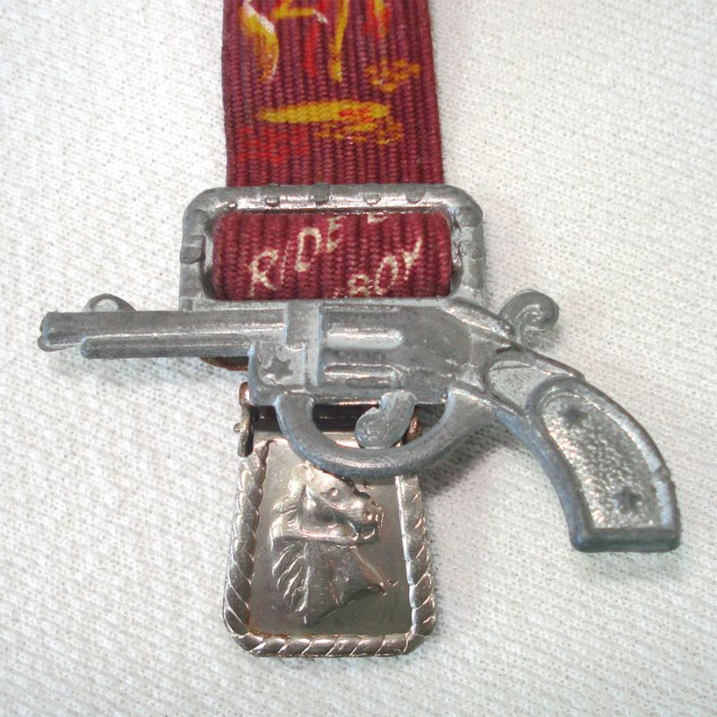A set of woven elastic Gene Autry suspenders for little cowboys or cowgirls from the 1940s. They are maroon red with yellow, red, and orange images of Gene Autry, his horse Champion. The length-adjusting slides are adorned with metal revolvers. The nickel end clips are embossed with horse heads, and have a patent number dating to 1945 on the backs.