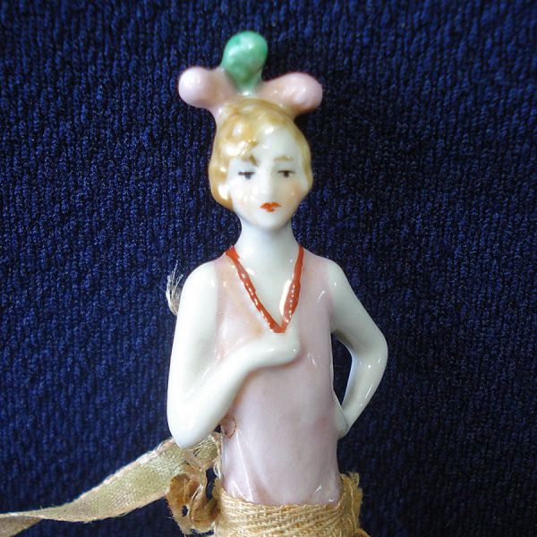 A petite or miniature size porcelain Art Deco half doll with legs, about 5 inches high. No markings are visible but I'm confident the flapper style doll is German from the 1920s. She wears a sleeveless pink tank top and has a pink and green 3-lobe feather crown tiara atop her short Marcel waved hair. The skirt is simply a wrap of aged cotton twill ribbon with ruffled lace and satin ribbon. The ribbon was probably looped at the back originally but is split now. There's a tiny spot of gold paint wear at the bottom of one shoe heel, it's not a nick or chip. Other than the age discoloration to the skirt, the doll is in excellent condition with no damage.