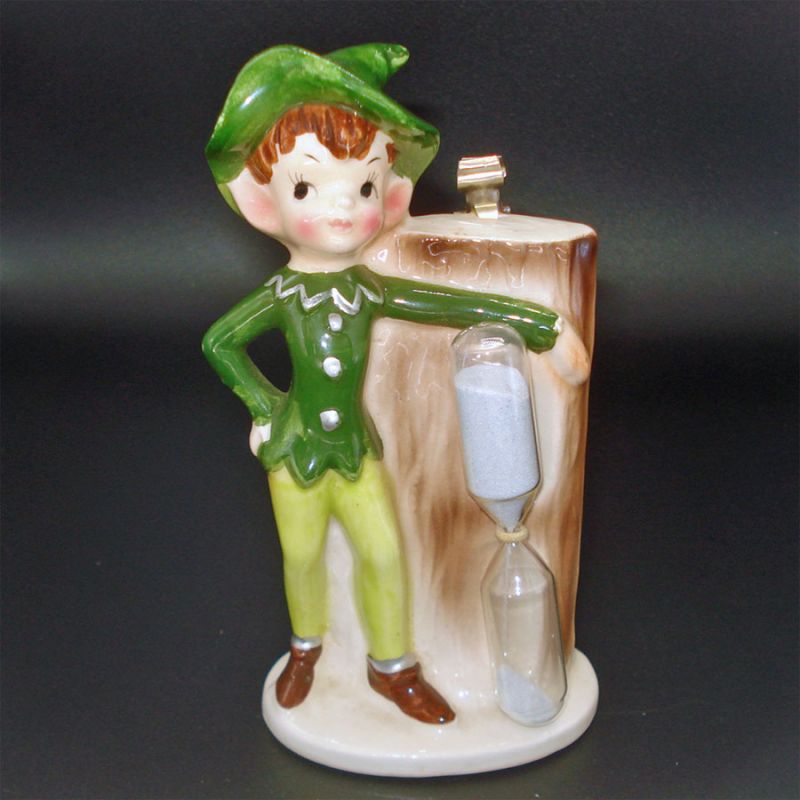 A charming, kitschy 1950s figural porcelain ceramic hourglass egg timer depicting a mischievous pixie elf in a Peter Pan suit leaning against a stump. About 5-1/4 inches tall, it has an elastic cord holding the glass timer in place and a metal clamp to hold a recipe card at the top of the log. The original foil Enesco Japan label is on the underside. The timer was part of a series of "Helpful Kitchen Pixie" kitchenware.