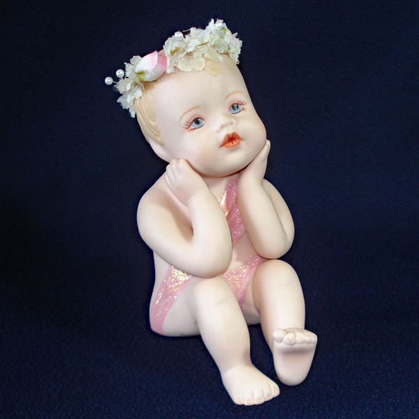 Realistic 5 inch bisque baby girl figurine with flower wreath and hands on cheeks by Hamilton Collection dated 1995
