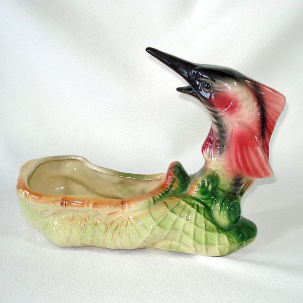 This colorful figural fish pottery planter in pink, black, green, and coral was made by American Bisque in the 1940s. My AB book calls it a sailfish but it looks more like a marlin to me (the planter is shown on the cover page of Mary Jane Giacomini's American Bisque Collector Guide). The planter measures 8 inches high by 10-1/4 inches wide and is in excellent condition with no damage or crazing.