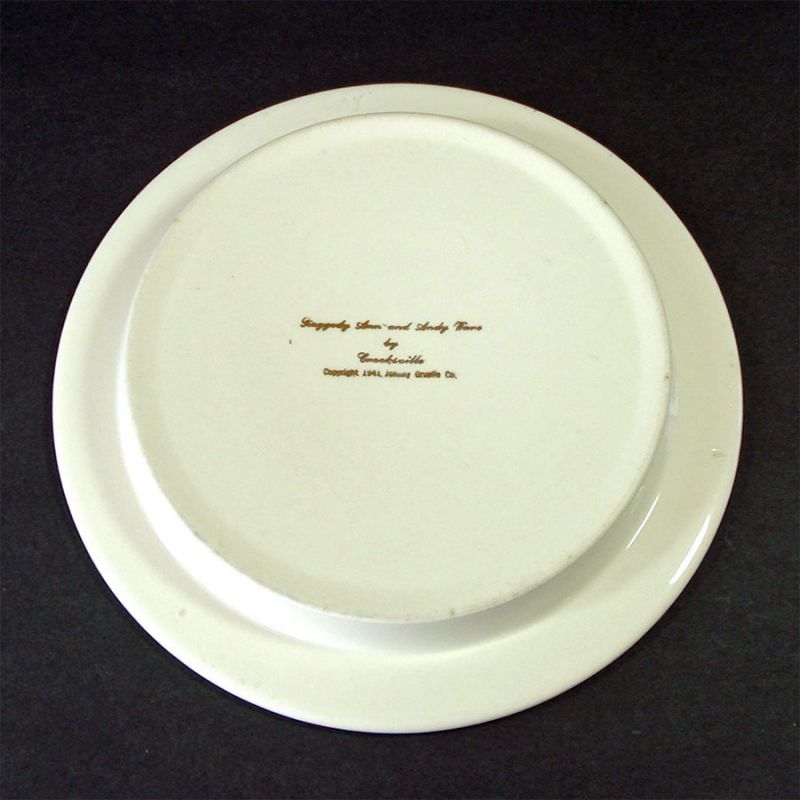 This sweet child's or baby feeding plate was made by Crooksville China in 1941. It depicts the original Raggedy Ann and Andy riding the wrinkled knees camel. The bowl measures 8-3/4 inches diameter.