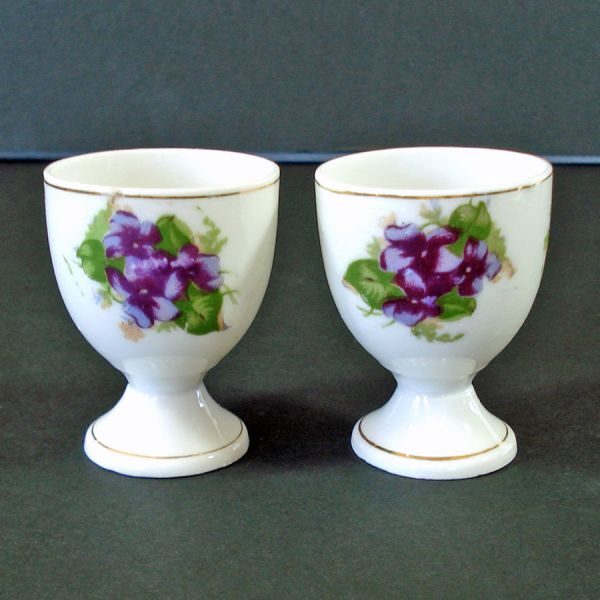 A pair of white porcelain egg cups decorated with purple violets on both sides. They're 2-1/4" high by 1-3/4 inches across the rims. There are no marks, my guess would be they were made in Mid Century Japan. No damage or crazing.