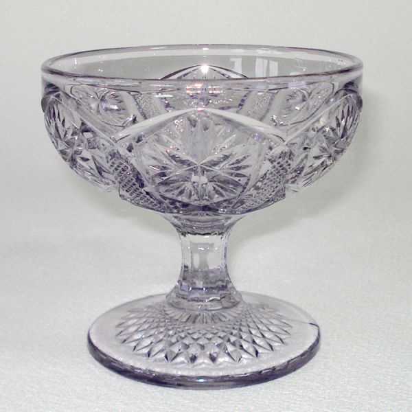 This 1916 Early American Pattern Glass sherbet is in the Star and File pattern number 612 by Imperial. Over the years it has turned a pale shade of purple from sun exposure. The sherbet stem is 3-1/2 inches high by 3-5/8" diameter across the rim. In excellent condition with no damage, scratches, or fleabites.