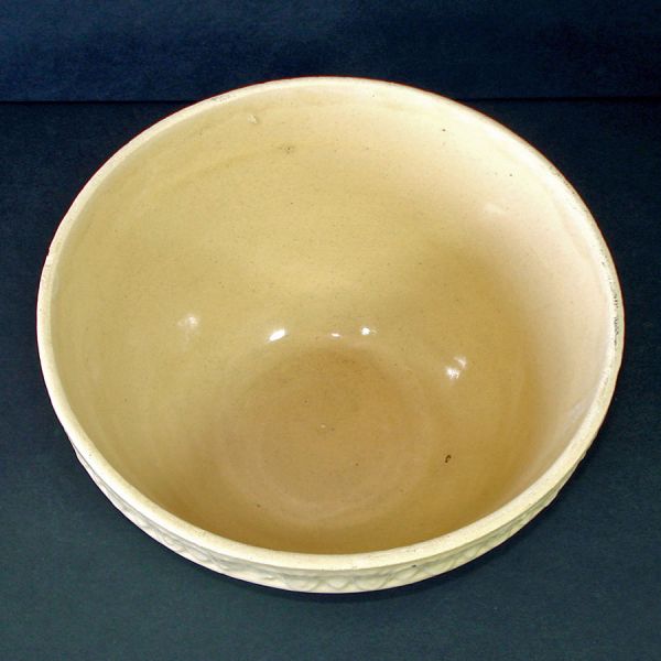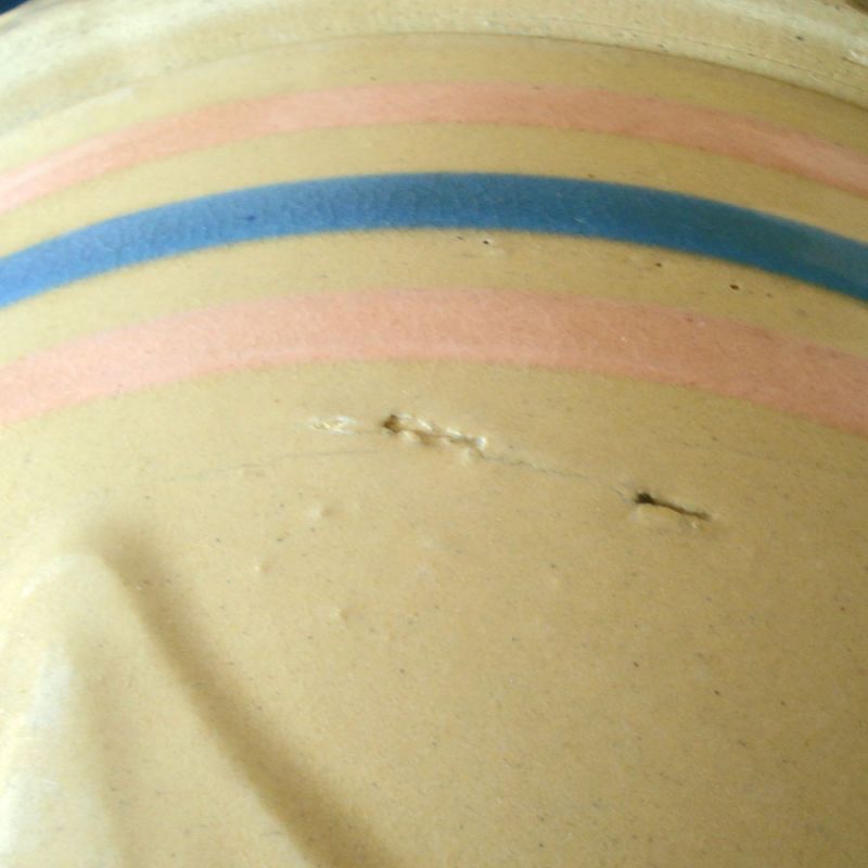 This circa 1930 yellow ware shoulder bowl was made by the Nelson McCoy Sanitary Stoneware Company. It has a 1-1/8 inch piecrust shoulder at the rim and a square base with embossed draping at the lower corners. Below the shoulder are pink and blue slip bands or rings. Several sizes of this style bowl were made - this is one of the larger sizes at 9-5/8 inches diameter by 5-1/2 inches high. It's in really good condition for this type of utilitarian kitchen bowl which were always made with flaws. The interior has one popped bubble. The sides have a couple of horizontal pre-firing scratches to the clay (these are not cracks). There are no hairlines or cracks, and no chips other than the few pinpoint fleabites at the rim. The underside is marked USA.