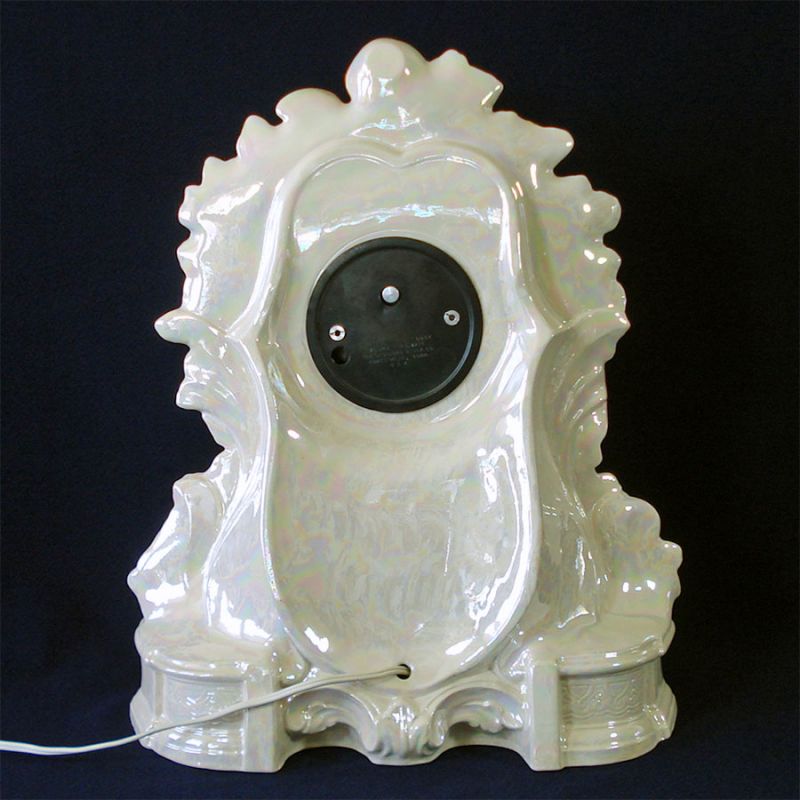 This Italian baroque style electric ceramic mantle or table clock has three cherubs arranged in an arch of grapes and leaves. The off-white finish is iridescent. The clock stands 15 inches high by about 12-1/2 inches wide and is 6-1/4" deep front to back. The 3-1/2 inch clock movement was made in the USA by Sessions; the clock itself was made by Newell Studios of California in 1967.
