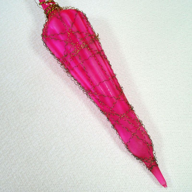 An antique unsilvered free blown glass German Christmas ornament, made in the late Victorian era (circa 1890s). It's in the form of a closed parasol, measuring just under 9 inches long. The ornament has flat paint decoration in very bright fuchsia pink and is wrapped in coiled gold bullion wire. The long unsilvered pike is spiral wrapped with wired yellow thread and a little silk tassel. The wires are amazingly intact, and so is the painted finish. flaking only a bit at the base of the neck. The only issue is a chip to the edge of the pike opening, which is a perfectly common thing even in ornaments many decades newer than this one. The lower spike tip isn't broken, it just has a clear pontil that is hard to see in the photos.