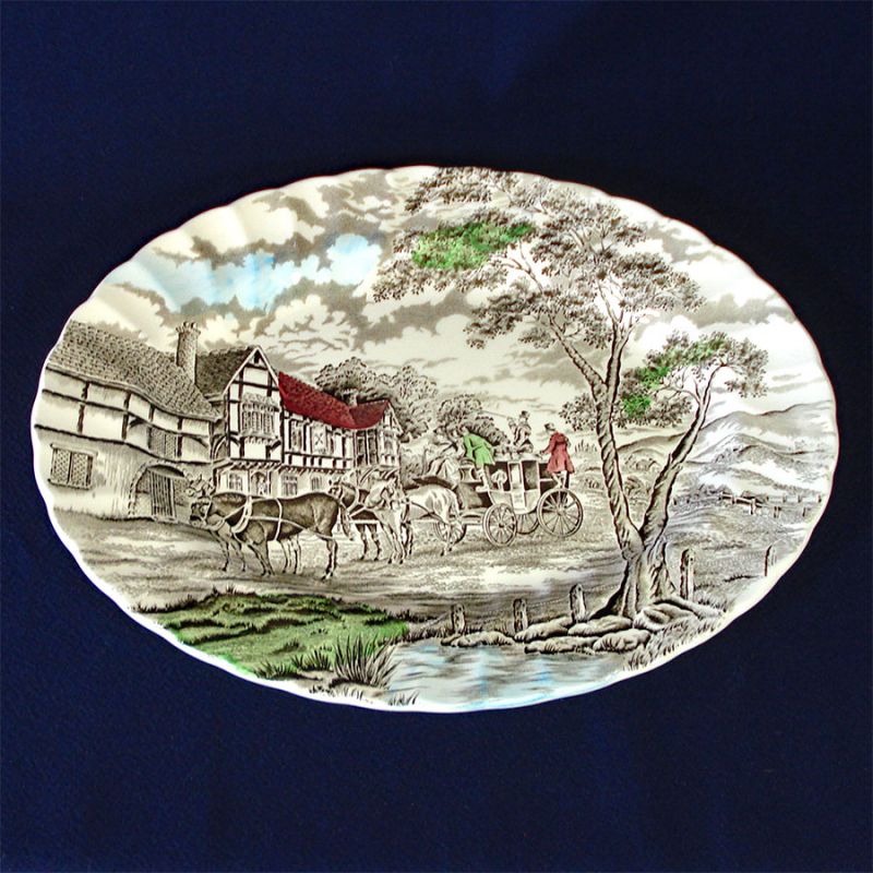 Like new 1982 English Staffordshire oval serving platter in the Royal Mail scenic transferware pattern by Myott. It was made in several solid colors, and multi-colored like the platter. It measures 12-1/2 by 10 inches and is in excellent glossy condition with no damage, wear, crazing, or utensil marks.