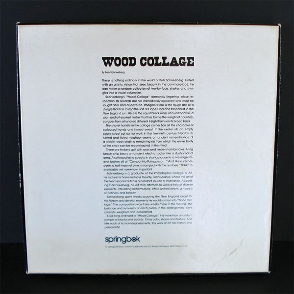 This 1973 Springbok 500 piece jigsaw puzzle is titled Wood Collage, created by artist Bob Schneeberg, renowned for his mosaics and collages using found objects and diverse elements. He scoured the New England coast for the water borne and water worn wooden objects in the collage.