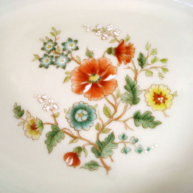 A crimped rim oval vegetable bowl in the Temple Blossom dinnerware pattern by Lenox, produced from 1978 to 1991. The pattern features delicate orange, yellow, and blue flowers with raised white enamel on fine ivory china with a center ring of 24k gold. The bowl measures 9-5/8 by 7-1/2 inches and is 1-3/4" deep. Two identical serving bowls are available, each in perfect condition with no wear, damage, or utensil marks.