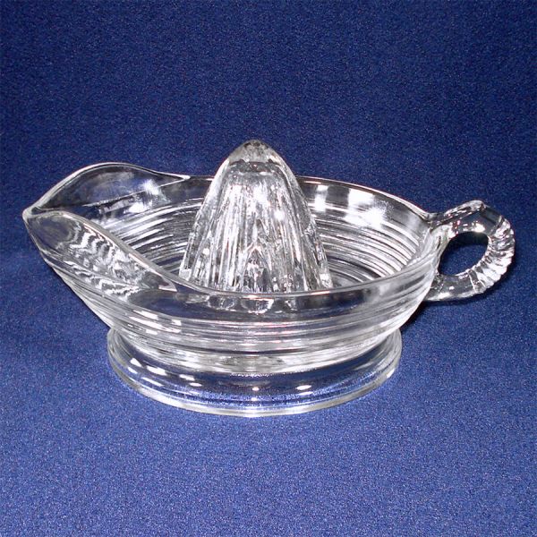 This vintage clear class juice reamer is identified all over the internet as being Anchor Hocking, Federal, and Hazel Atlas, among others. After spending more than a couple of hours researching my glass and kitchenware books, I can't confirm who made it. It has a nice concentric rings or circles design around the bowl and ring handle. It measures 5-3/4" diameter at the non-spout side of the rim and holds about a cup of liquid. The juicer is in excellent condition, crystal clear with no damage.