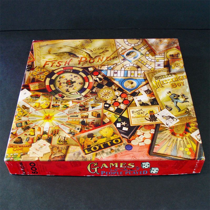 This 500 piece 1994 Springbok by Hallmark jigsaw puzzle is titled Games People Played, number PZL2472, featuring a collage of antique board and card games. It has been worked and is guaranteed complete. Assembled size is 20 by 20 inches. Box is intact with no splits or tears, just a little edge wear.