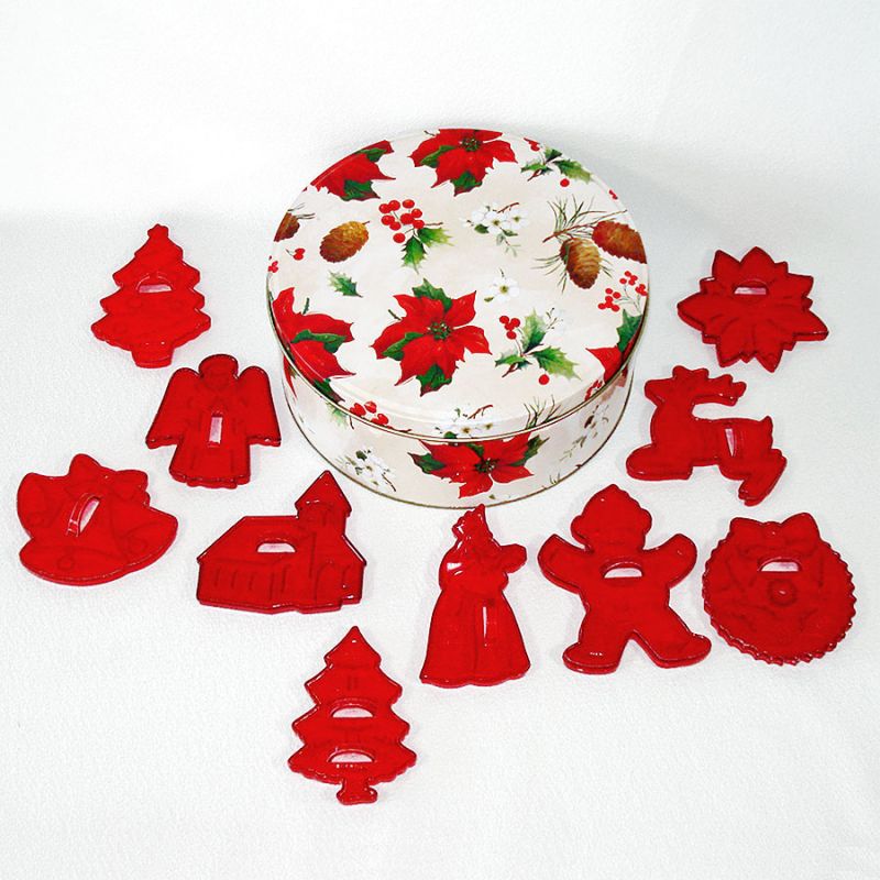 An assortment of ten Mid Century HRM transparent red plastic holiday cookie cutters stored inside a Christmas candy or cookie tin. The Christmas themed cookie cutters include a reindeer, angel, bells, wreath, poinsettia, church, wise man, and two sizes of Christmas trees. They're marked with the HRM crown logo and Made in USA, some also say Educational Products Pat. Pend. Each has a hole at the top if you want to hang them from the Christmas tree or window as ornaments. The larger tree has a split to the ring handle, and the angel cutter is missing the handle ring. The others are in good, clean vintage condition.