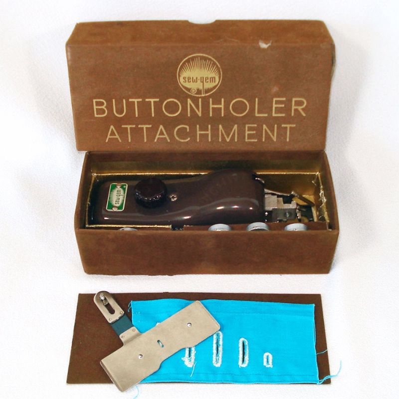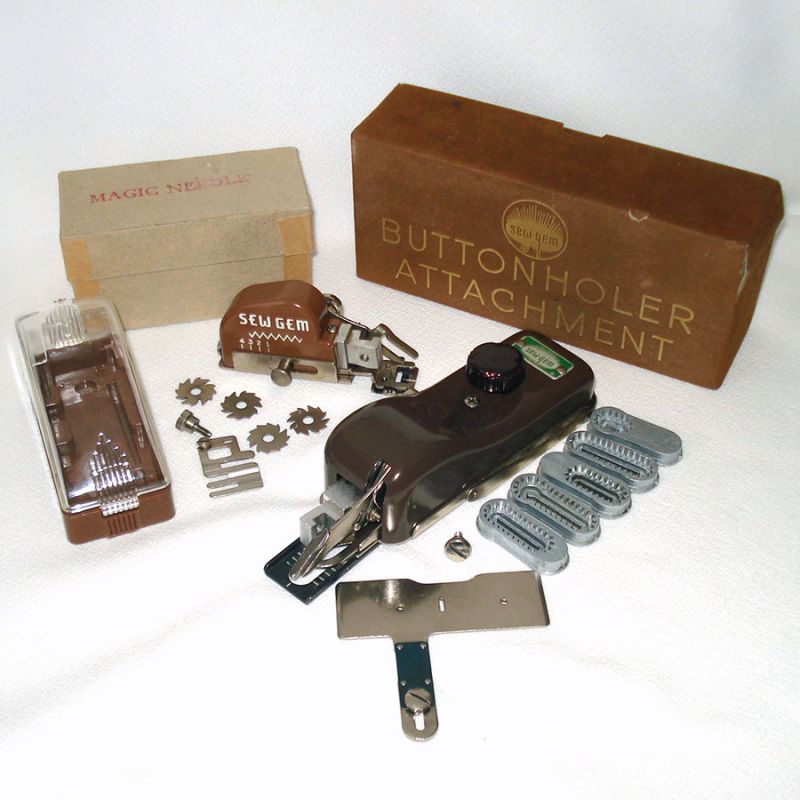 Two boxed attachments for the 1950s Sew Gem sewing machine, made by Gellman Mfg of Illinois. The buttonhole attachment is complete with plate, screws, and five cams. The zigzag attachment is also complete. Neither attachment has instructions but they are available online.