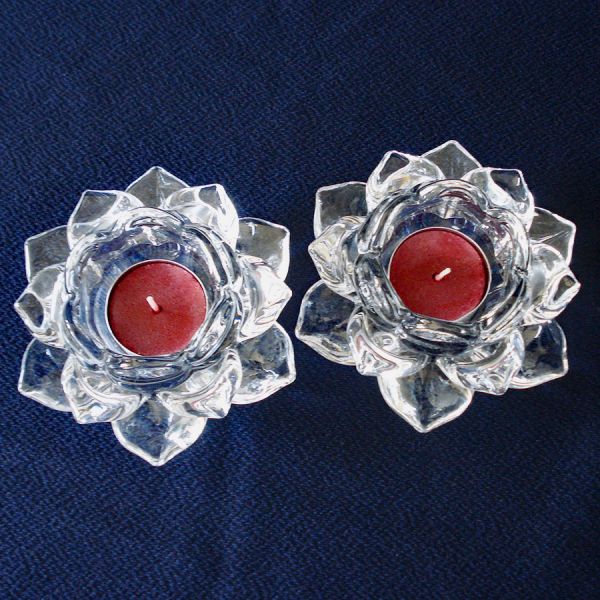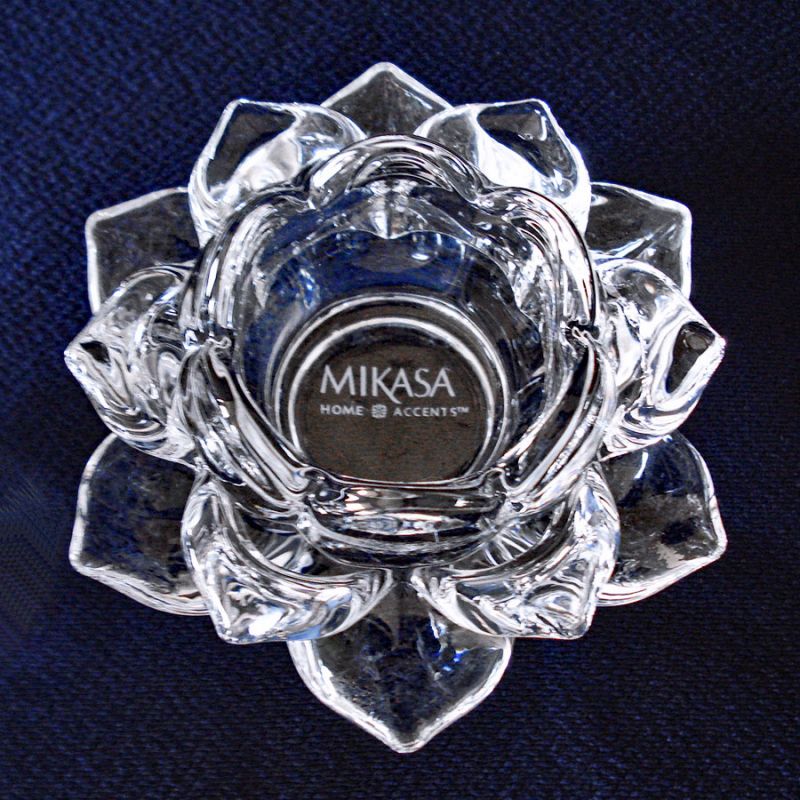 A set of seven beautiful crystal lotus flower or water lily tea light candle holders from Mikasa, each nearly 5 inches diameter by 2-1/4" high. Most are marked Mikasa Home Accents on the bottoms. The candle holders have three layers of six petals. Each comes with a burgundy or maroon colored unused tea light candle, but they'll also take standard votive candles. All are in perfect condition with no damage, scratches, or cloudiness. I don't believe they've ever been used. If you want fewer than seven, contact me. I'll sell them separately for $15 each.