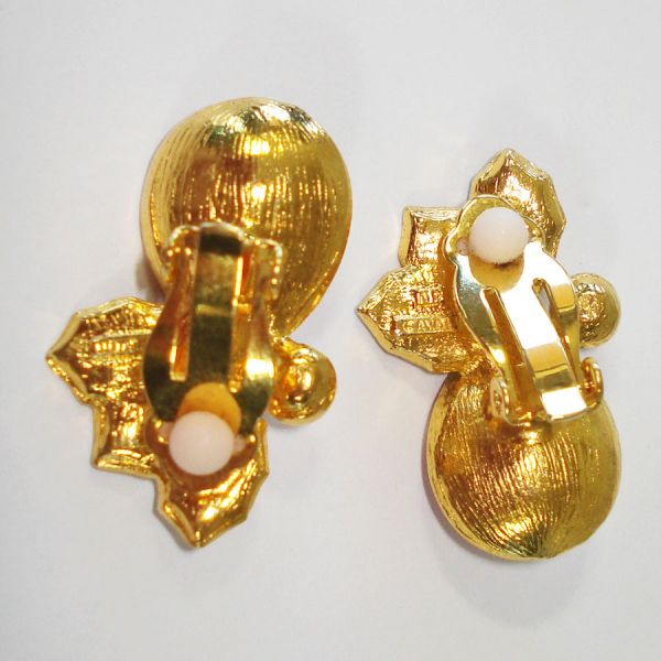 A pair of especially pretty vintage clip-on goldtone earrings from Avon with a big faceted red teardrop or pear shape stone topped by a crystal rhinestone and three enameled holly leaves with two red berries. They're 1-1/4 inches long and in excellent condition with no wear, damage, or other issues. Marked Avon on the backs.