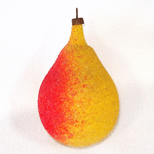 Beautiful early 1900s unsilvered glass fruit Christmas ornament from Germany - a 3-3/4 inch realistic ripe pear. The thin clear glass is thickly coated in colored and clear ground glass glitter, yellow with a bright red-pink blush on one side. It even has a little painted black stem dot at the bottom. The sugar-type coating is still remarkably good for a 100-plus year old ornament with no discernible shedding. There are no chips or breaks.