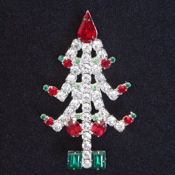 A lovely larger size silver tone rhinestone Christmas tree brooch or pin by Kenneth Jay Lane, 2-3/4 inches high by 1-3/4" wide across the bottom branches. The round, pear shape, and square crystal rhinestones are clear, red, dark green, and light green. The brooch is in excellent condition with no damage, darkening, or wear. Marked Kenneth Lane with copyright symbol.