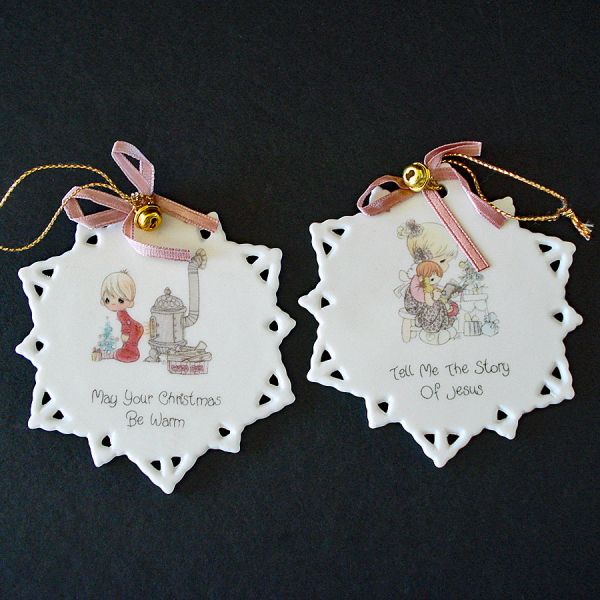 A boxed set of four Samuel Butcher Precious Moments Christmas ornaments by Enesco, dated 1990. They're 3-1/4 inch flat porcelain snowflakes, each with a scene and phrase. The tops are decorated with pink ribbon, tiny brass bells, and a gold cord hanger. In excellent condition with no wear or damage to the ornaments or box.