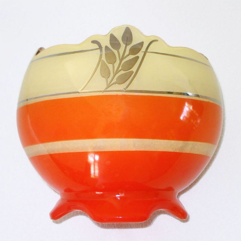 This Art Deco decorated footed flower or rose bowl was made by Indiana Glass in their 1930s Moderne Classic line. It's about 6-1/2 inches at its widest by 6 inches high. The interior is painted butter yellow, the bright orange stripes and platinum leaf decoration are on the exterior. There is some paint wear in the very bottom (rub wear from flower stems no doubt), otherwise the bowl is very good condition with no chips, flakes, or platinum loss.