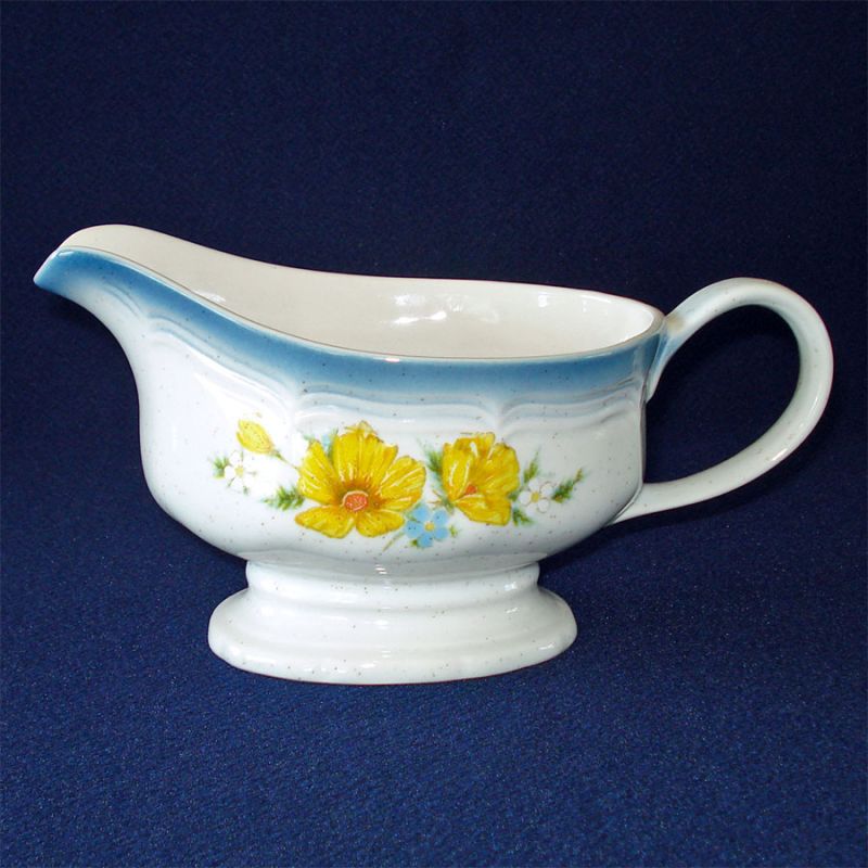 A gravy boat in the pretty Amy dinnerware pattern by Mikasa, produced from 1977 to 1985. It has bright yellow buttercup type flowers with blue and white forget-me-nots on a speckled white background with blue rim. It measures 4-1/2 inches high by more than 8" long handle to spout and holds 2-1/2 cups. In excellent, still glossy condition with no damage or wear. See my other listings for more Amy pieces.