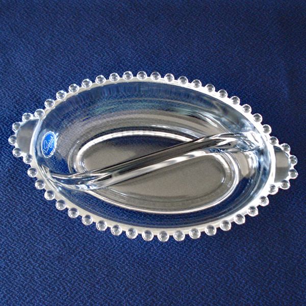 This 8 by 5 inch divided oval relish dish is in the crystal Candlewick pattern by Imperial Glass. It's in perfect, mint condition with original foil label still attached.
