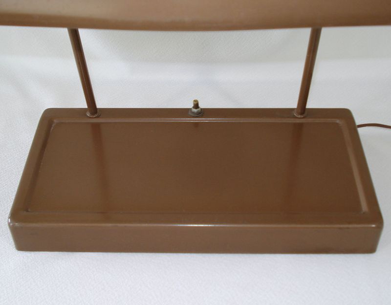 This 1950s to early 1960s Machine Age style fixed shade brown enameled steel desk lamp was made by PN Luminous Equipment Company. The roomy platform base that can hold your pens, notepads, or post-it notes (not that they were even invented back when this was made). Height is about 12 inches, width of the shade 20", and the base is 13 by 7 inches. The lamp takes two fluorescent tubes (included) and it works well. The 6-1/2 foot brown cord has no issues, but of course the plug is the old fashioned, non-polarized type. There are a few very minor scuffs or rub marks on the shade and the front edge of the base, nothing noticeable.