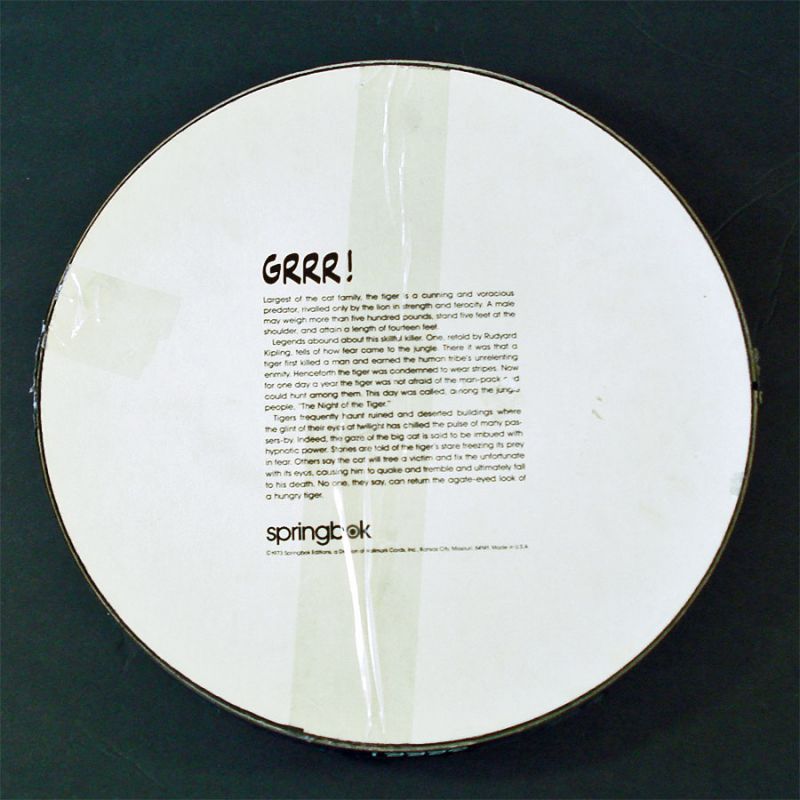 This 1973 Springbok Editions 500 piece round jigsaw puzzle is titled simply Grrr! It's a photographic depiction of a majestic tiger's face in closeup. Assembled size is 20-3/8 inches diameter. The puzzle has been worked and is guaranteed complete. The box is intact but has strips of clear tape across the bottom and lid.