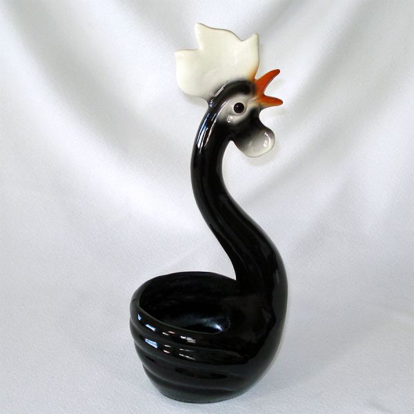 I wonder what the deal was with chicken decor in the 1950s? Chicken figurines, wall decor, dinnerware, all types of kitchen accessories, and even curtains. Here's a delightful take on the Mid Century chicken obsession: a friendly looking, long necked black crowing rooster ceramic planter from Maddux of California, whose owner, William Maddux, specialized in art pottery birds of all types.