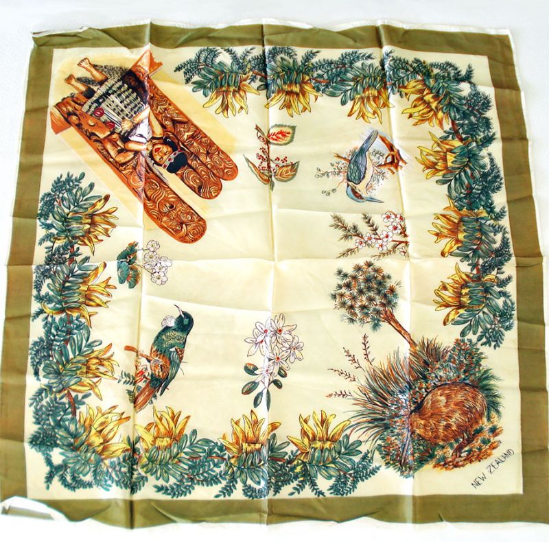 This vintage rayon scarf was a souvenir of New Zealand. It measures 26-1/2 inches square and is decorated with indigenous plants, animals, birds, and a native Maori girl with carved Tiki totems. The scarf has never been used and has no wear, stains, or odors.