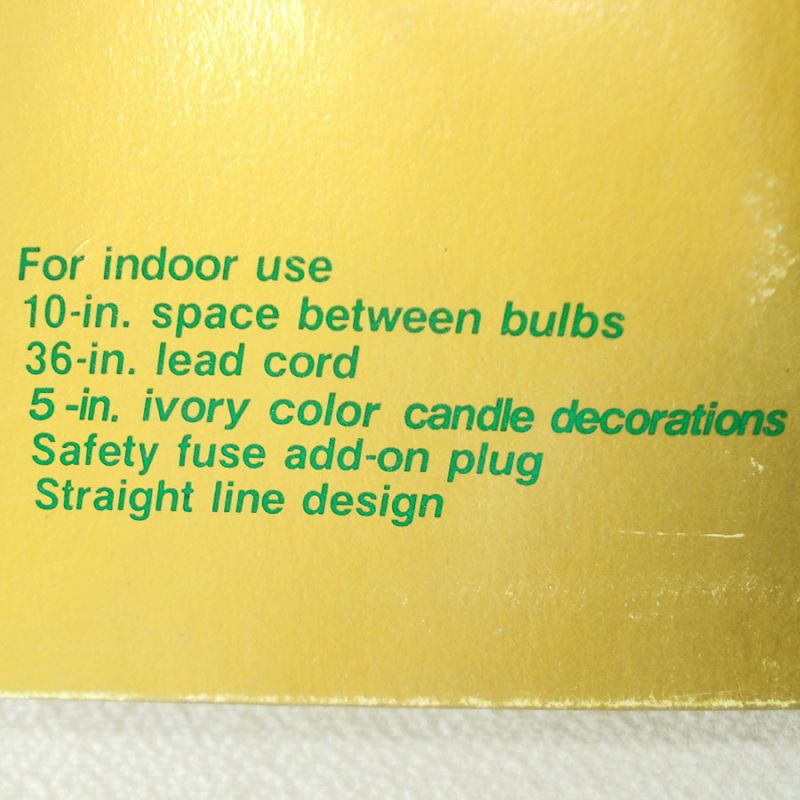 This boxed set of Christmas candle lights from Sears dates to the late 1960s or early 1970s. Though the box has a little storage wear, the lights were never used - the string is still wrapped in the original perfect factory coiling with all tags and the bag of spare bulbs still intact.