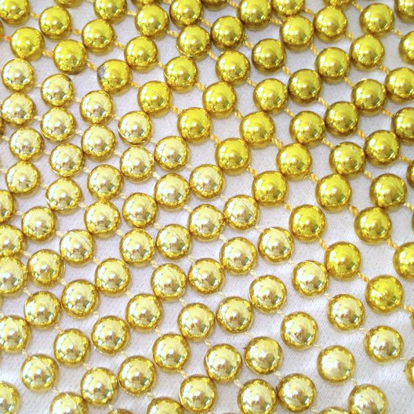 A large lot of fused gold bead Christmas tree garland strings, enough to decorate a very large tree, maybe more than one. There are a dozen strands, each measuring between 108 and 124 inches long, totaling just over 1400 feet or 466 yards. The 1/4" diameter plastic beads are fused onto the cord and have a bright gold metallic finish. Some have a somewhat lighter coloring, which I tried to show in the second photo, but the difference in shade is minimal. All 12 strands are in excellent condition with no finish wear or chipping.