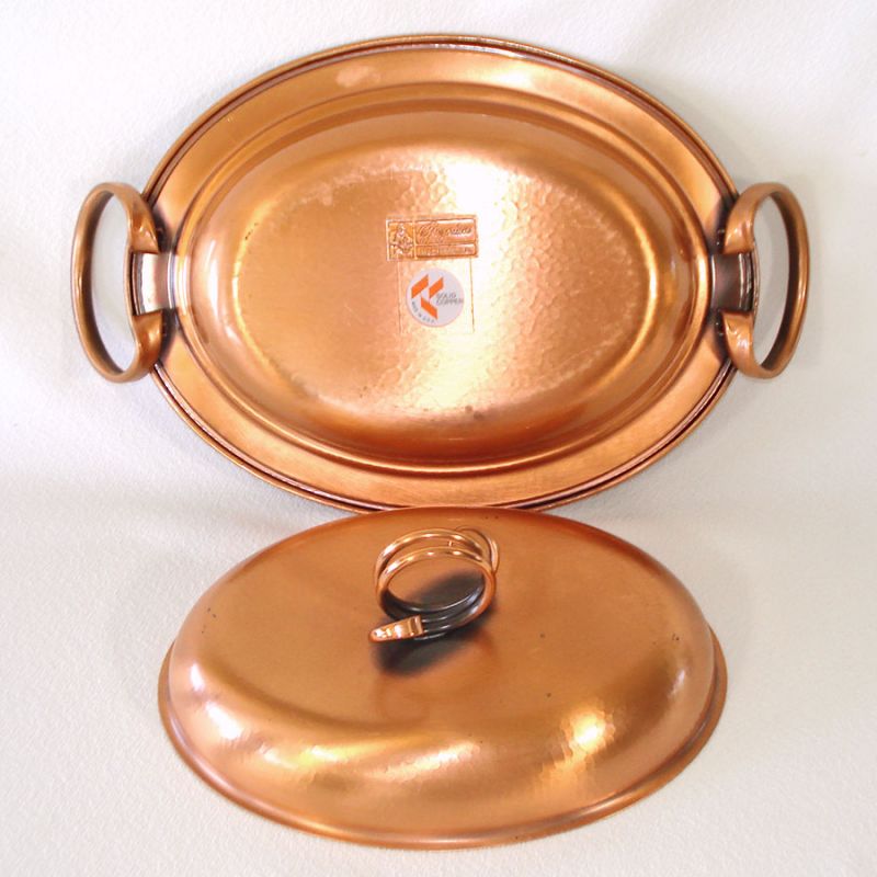 The bottom measures 11-1/2 by nearly 9 inches not including the handles. With the lid in place, overall height to the finial is 5-1/2 inches. Inside is a shallow GlasBake oval au gratin type liner dish marked Ovenware Made In USA 55-8 in pristine condition. The original Gregorian Over-To-Tableware brochure is present and a copper foil "Gregorian Made In USA" label is on the underside. There are a few pinpoint tarnish specks to the lid and rim which may polish out, but you'd probably have to remove the lacquer coating first.