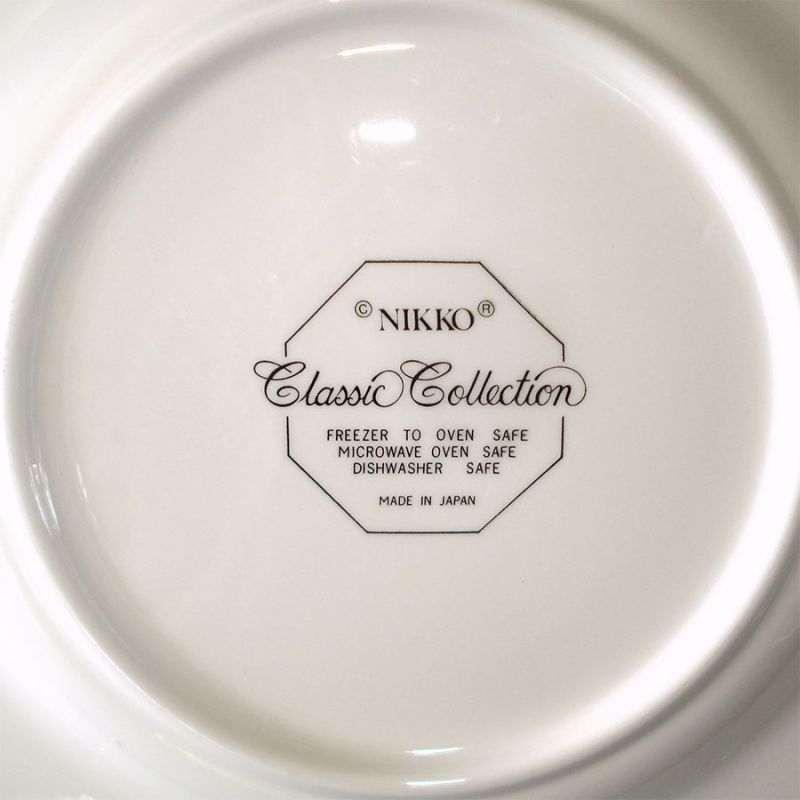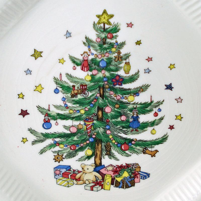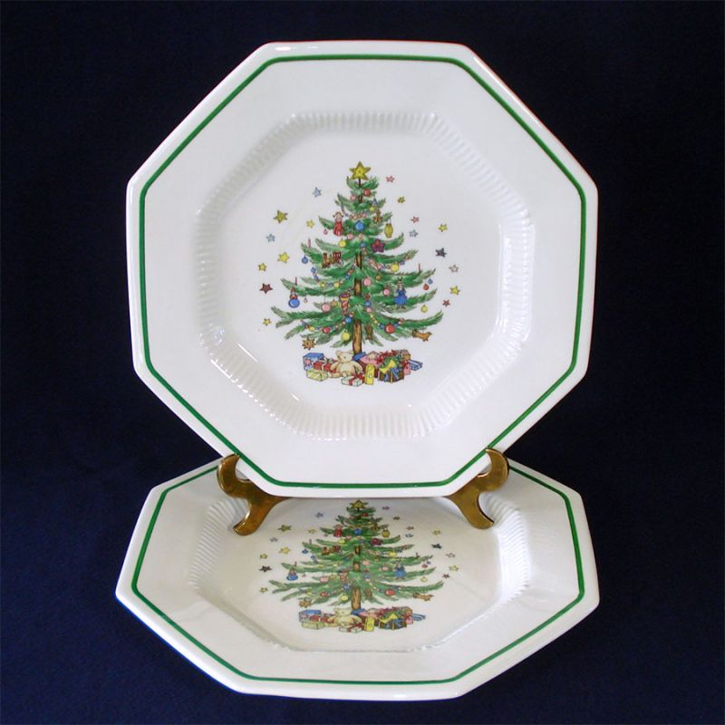 A pair of 11 inch octagonal dinner plates in the Christmastime pattern by Nikko of Japan, featuring a festive old fashioned decorated Christmas tree. It was a popular holiday pattern, produced from 1975 to 2014. The plates have no damage but there is circular white crazing to the glaze in the centers, reflected in the price.